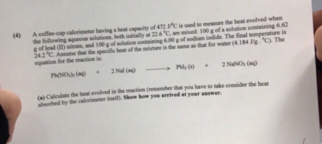 A coffee cup calorimeter having a heat capacity of 472. 100 g of a solution containing 662 g of lead ii nitrate and 100 g of solution containing 600 g of sodium iodide. A constant pressure coffee cup type calorimeter having a heat capacity of 472 joc1 is used to measure the heat evolved when the following aqueous solutions both initially at 226 oc are mixed. G of solution containing 662 g lead ii nitrate and 100.