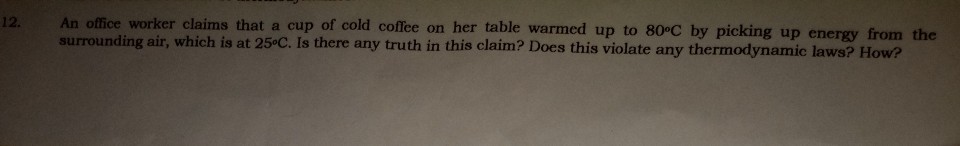 An office worker claims that a cup of cold coffee on his table warmed up to 800c by picking up energy from the surrounding air which is at 250c. An office worker claims that a cup of cold coffee on his table warmed up to 80 o c by picking up energy from the surrounding air which is at 25oc. An office worker claims that a cup of cold coffee on his table warmed up to 80 c by picking up energy from the surrounding air which is at 25 c.