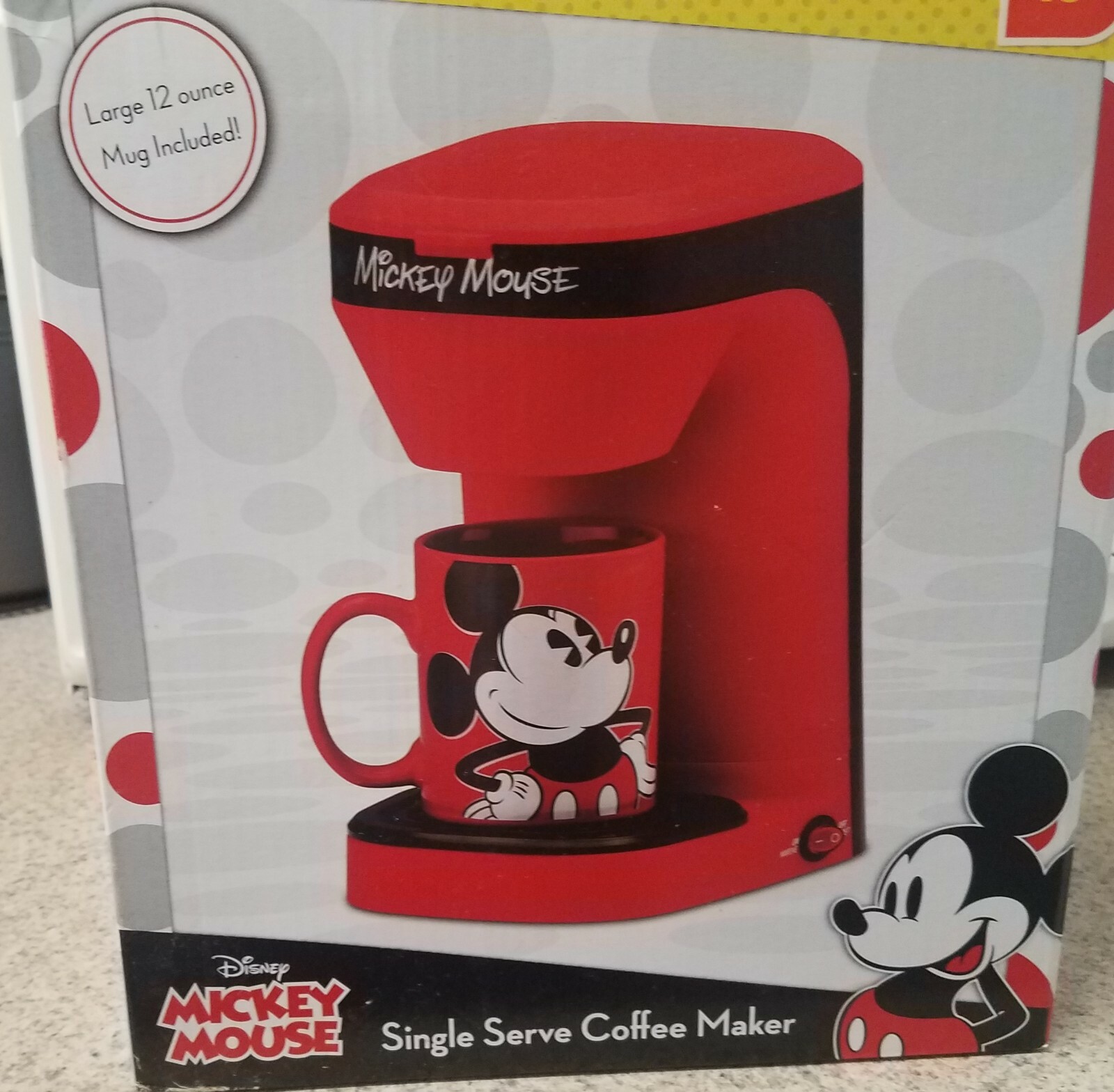 Disney mickey mouse 1 cup coffee maker with mug. No waste no fuss just a fresh 12 ounce cup of coffee every time.