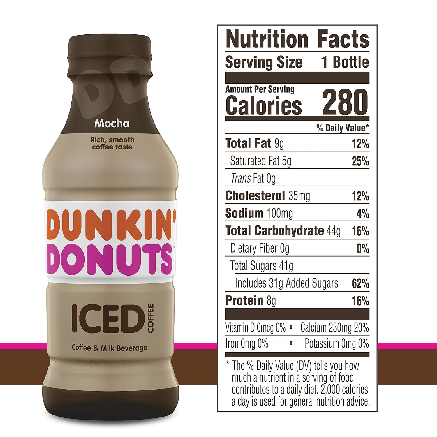 How many calories in a dunkin donuts mocha iced coffee. There are 290 calories in 1 bottle 137 oz of dunkin donuts mocha iced coffee. Dunkin donuts iced coffee is a delicious drink that gives the energy boost you need to make it through the day. 2000 calories a day is used for general nutrition advice but calorie needs vary.