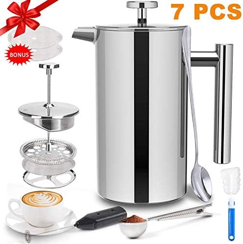 Amazon Com Upgraded French Press Coffee Maker 34 Oz French Coffee Press Set Includes Coffee Cups Milk Frother Coffee Press With 4 Filters Screen 304 Stainless Steel Heavy Duty Heat Resistant Glass
