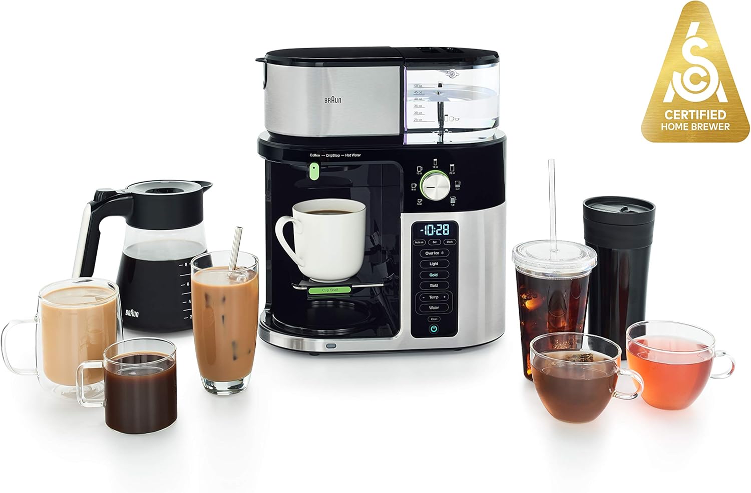 Braun 10 cup multiserve coffee maker in stainless steelblack multiserve drip coffee maker with stainless steel design offers complete quality drip coffee experience with 7 convenient beverage sizes from pod free single serve to full 10 cups complete with over ice and sca certified golden cup brew options. Braun kf7150bk brew sense drip coffee maker stainless steel and black finish. View on vehicle tell us where youd like to shop.