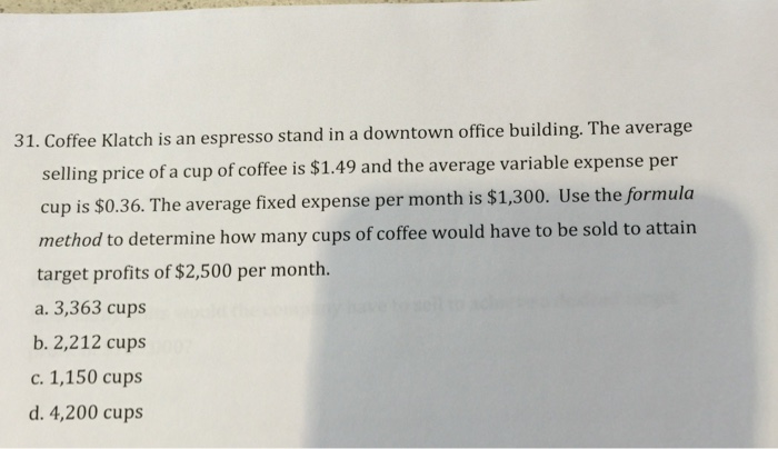 Coffee klatch is an espresso stand in a downtown office building. The average selling price of a cup of coffee is 149 and the average variable expense per cup is 036. Use the formula method to determine how many cups of coffee would have to be sold to attain target profits of 2500 per month.