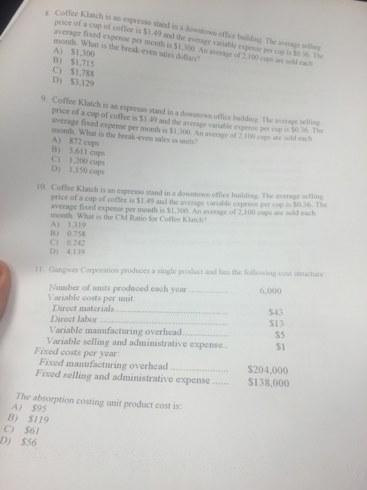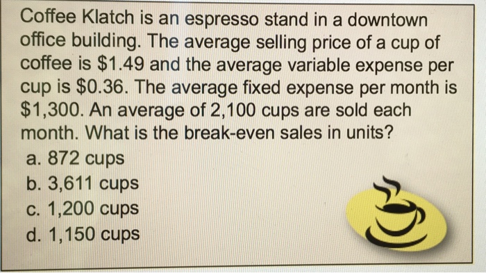 The average selling price of a cup of coffee is 149 and the average variable expense per cup is 036. Coffee klatch is an espresso stand in a downtown office building. Coffee klatch is an espresso stand in a downtown office building.