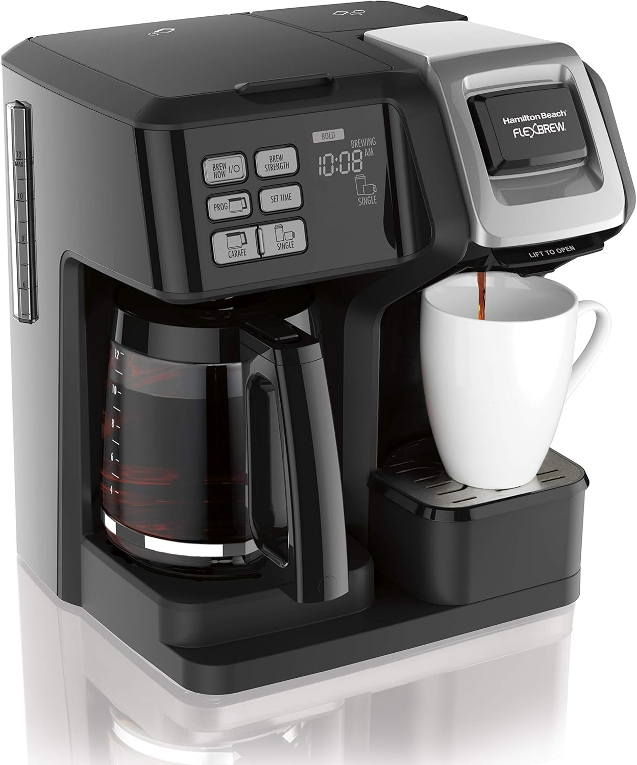 Make a full 12 cup pot with the carafe side option or start your day on. With the 2 way flexbrew coffee maker you can brew a single cup or a full carafe or even program your pot of coffee to be ready when you wake up. No matter which way you brew select a brew lets you choose bold or regular brewing strengths.