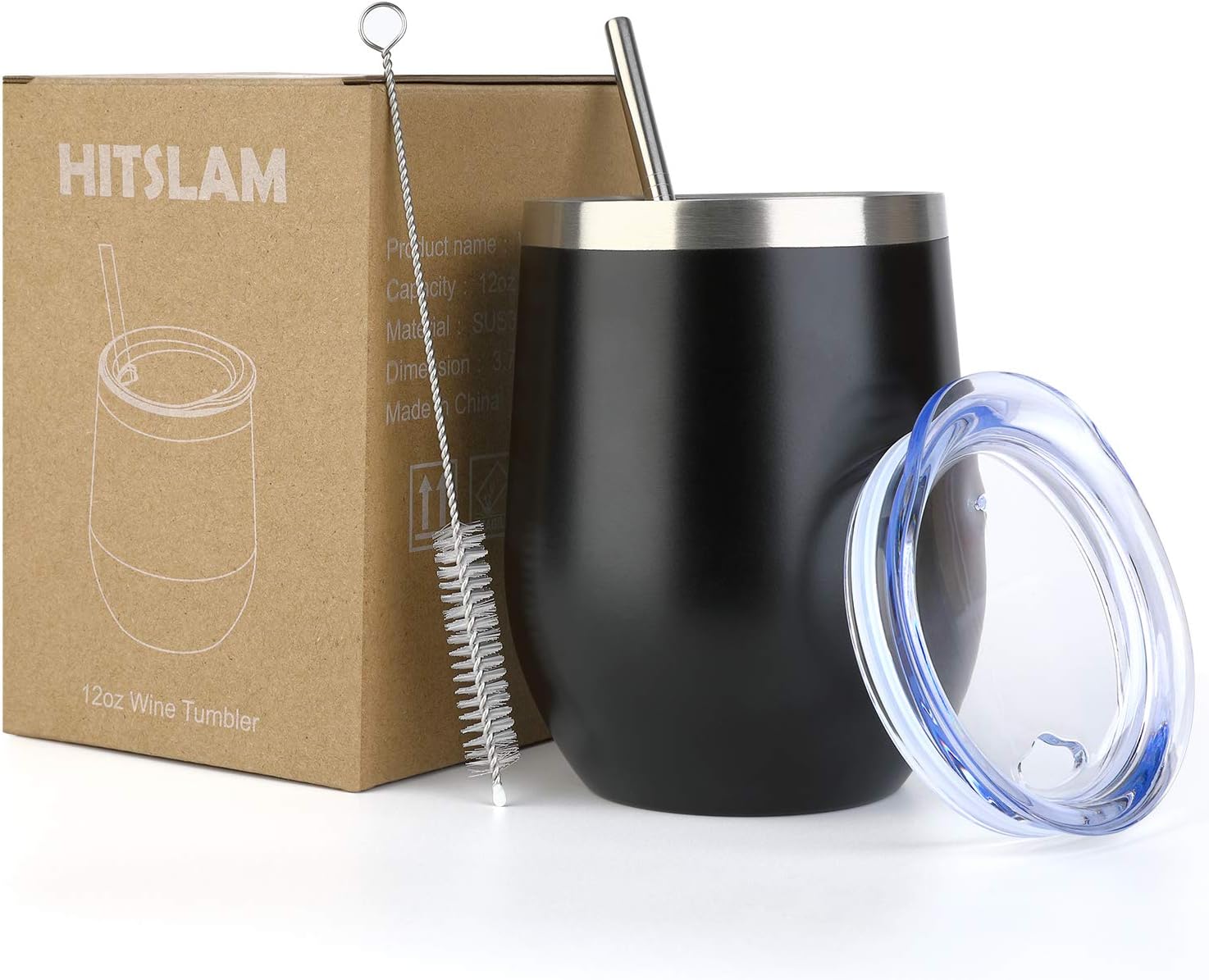 Amazon Com Hitslam Wine Tumbler 12oz Stainless Steel Tumbler Vacuum Insulated Wine Glass Double Wall Coffee Mug For Champaign Beer Office Use Includes Straw Lid Straw Cleaning Brush Matte Black Tumblers