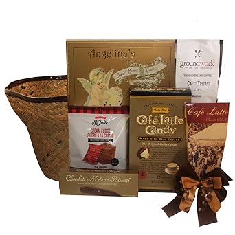 We blend the most popular assortment of coffee flavored goodies into a beautiful gift arrangement that just happens to fit any gift giving occasion and budget. Each basket is hand crafted with attention to detail shrink wrapped and tied with a bow for presentation ready for gift giving. Espresso yourself coffee lovers gift basket espresso yourself basket.