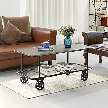 11oca2020 francie coffee table in oak antique gray acme furniture 82860 francie coffee table in oak anti. It has a metal frame making it perfect for adding modern aesthetics to your interior design. This table features a butcher block top and metal mesh lower shelf supported by wheels in the form of a cart.