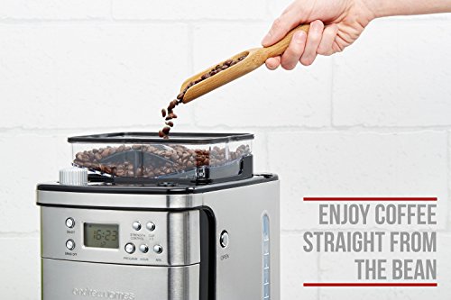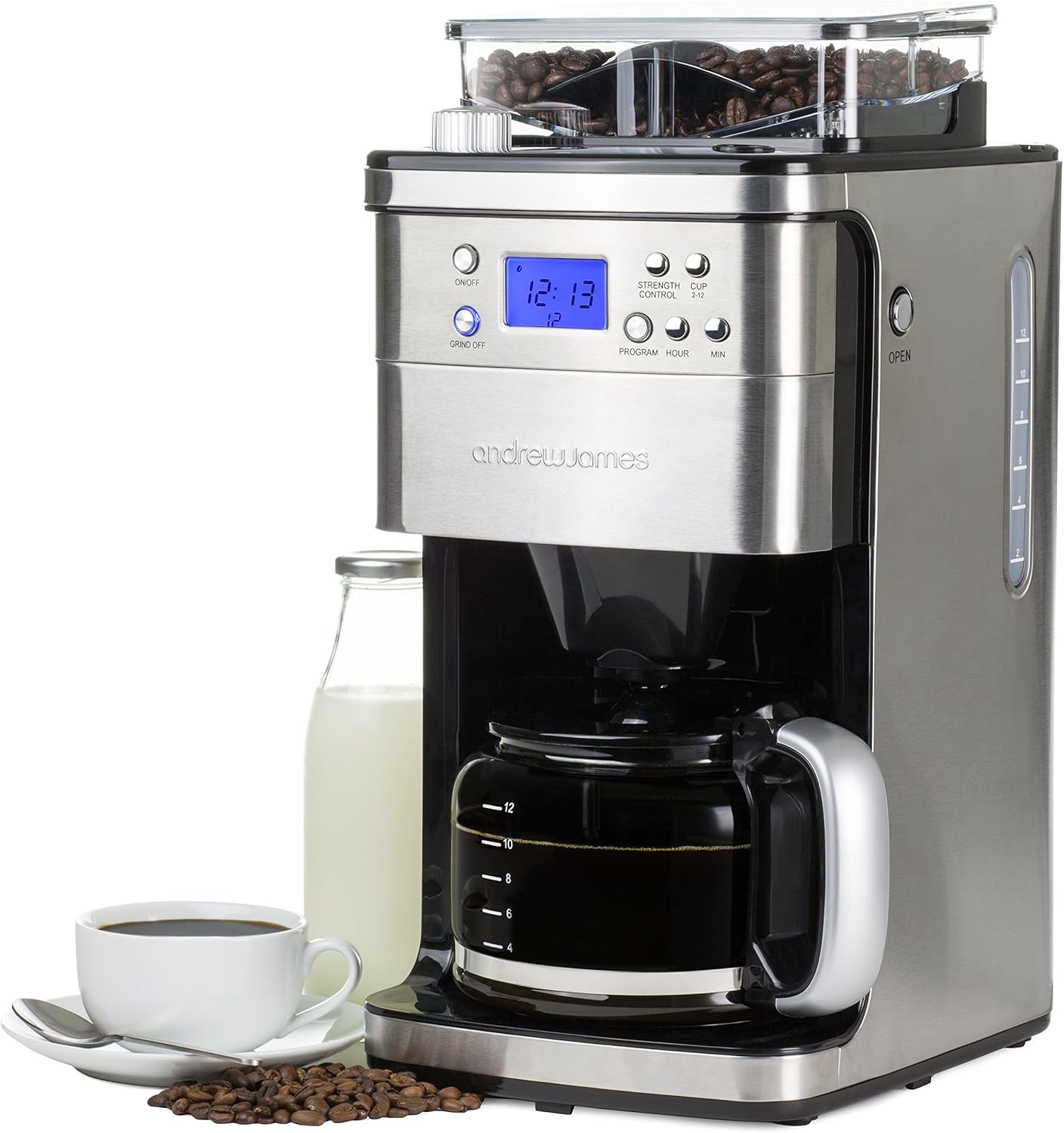 Andrew james coffee maker machine with bean to cup grinder. The difference just a small thing like integrated bean grinding will make to your coffee will be worth the money. This digital machine is simple to use and can make 2 12 cups of fresh coffee at a time. Andrew james premium programmable chrome filter coffee maker this is a bean to cup filter coffee drip machine and is designed to make filter coffee rather than espressos or cappuccinos.