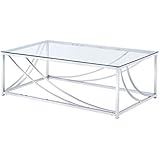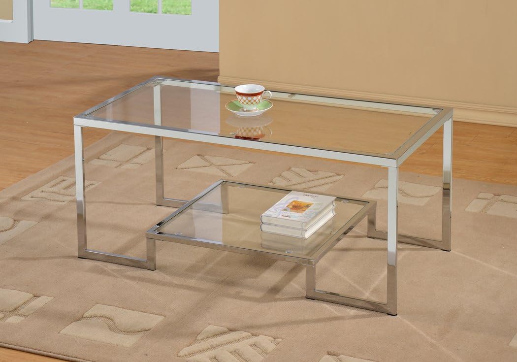 This tempered clear glass chrome metal frame cocktail coffee table with bottom shelf 44w is a great addition to your home decor. Frame comes in chrome finish. The living space accent piece is ideal for use as a coffee table.