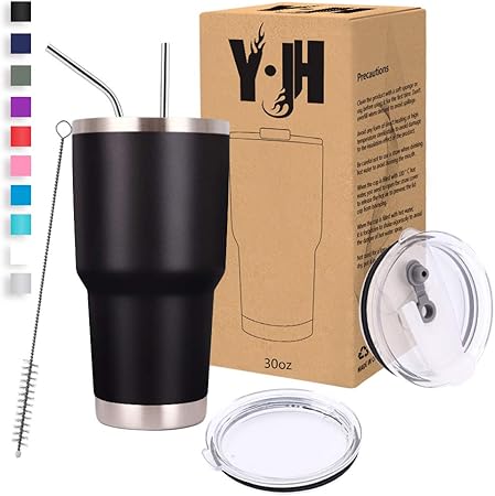 Y J H 30oz 850ml Travel Tumbler Double Wall Vacuum Insulated Coffee Mug Stainless Steel Coffee Cup With 2 Splash Proof Lid 2 Straws Free Cleaning Brush Bpa Free Black Amazon Co Uk Kitchen