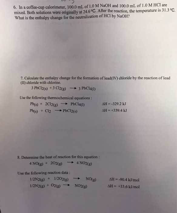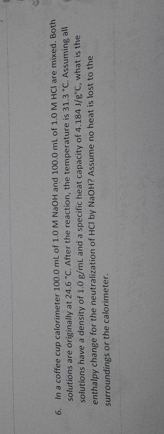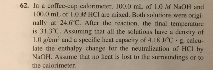 Both solutions were originally at 246circ mathrmc. After the reaction the final temperature is 3130c. In a coffee cup calorimeter 1000 ml of 10 m naoh and 1000 ml of 10 m hcl are mixed.