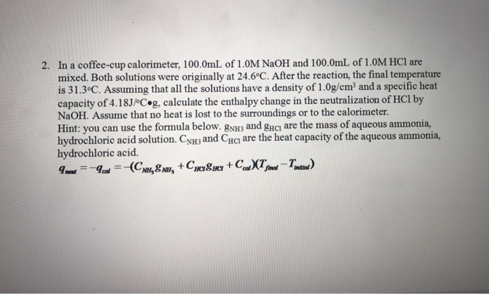 After the reaction the final temperature is 3138c. In a coffee cup calorimeter 1000 ml of 10 m naoh and 1000 ml of 10 m hcl are mixed. Assuming that all the solutions have a density of 10 gcm 3 and a specific heat capacity of 418 j0cg calculate the enthalpy change for the neutralization of hcl by naoh.