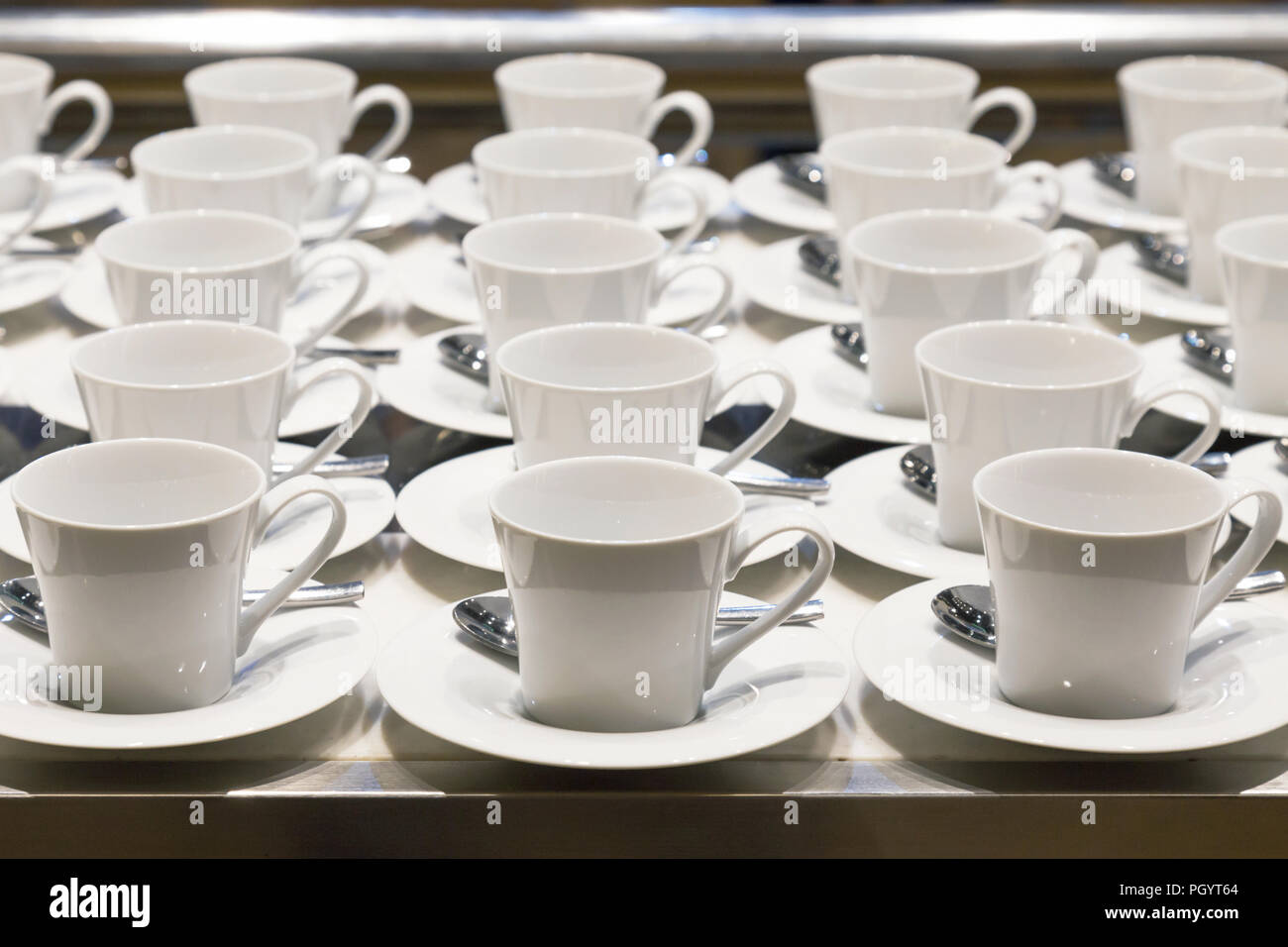 Row Of Coffee And Tea Ceramic White Cup Preparing To Serve On The Business Conference In Front Of The Meeting Room At The Hotel Stock Photo Alamy