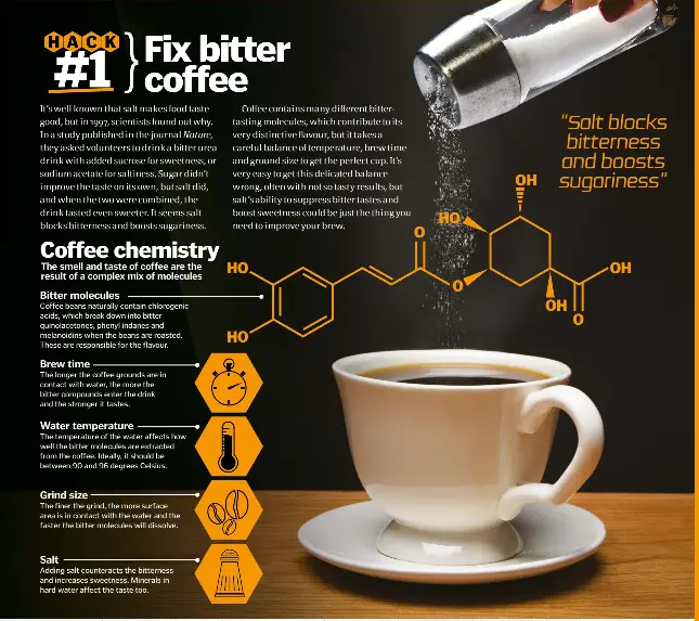 Using the wrong coffee roast type. Too high water temperature. Adding a dash of salt to your coffee can help to suppress the bitterness in the coffee and enhance the coffees flavor.