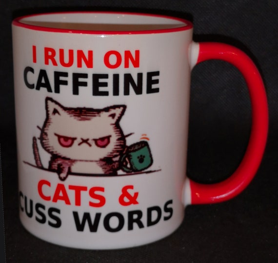 I run on caffeine cats and cuss words coffee mug. Impression double sided classique c handle en ceramique. Ceramic mugs are 11 ounce and come in two styles all white or with black handle and interior. I run on caffeine cats and cuss words mug we can customize any of our items for an even more personal touch.